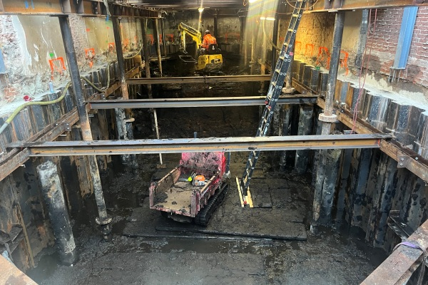 Om onder een bestaand pand een kelder uit te kunnen graven, kan met damwanden een bouwkuip gerealiseerd worden. Het doet dat met eigen gebouwde machines.