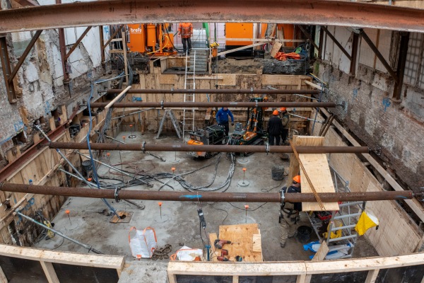 Om onder een bestaand pand een kelder uit te kunnen graven, kan met damwanden een bouwkuip gerealiseerd worden. Het doet dat met eigen gebouwde machines.